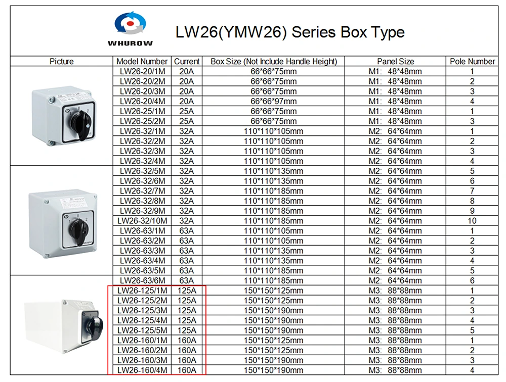 YAMING LW26 125A 160A 防水ボックス カム スイッチは、産業用電気制御の厳しい要求を満たすように設計された高性能 3 ポジション切り替えロータリー デバイスです。電気スイッチ生産を専門とする大手工場である浙江亜明電気有限公司によって開発されたこのスイッチは、実用的な防水設計と安定した制御性能を統合しており、複雑な環境で回路を接続または切断するための信頼できるソリューションを提供します。その内部モデル YMW26-125M 160M は、YAMING の厳格な製品コーディング システムの証であり、生産プロセス全体を通じてトレーサビリティと品質管理を保証します。
