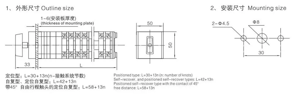 さまざまなシナリオの多様な制御ニーズを満たすために、LW12 16A インジケータライト切り替えスイッチ付きショートハンドルは、さまざまな寸法に従って複数のタイプに分類されています。