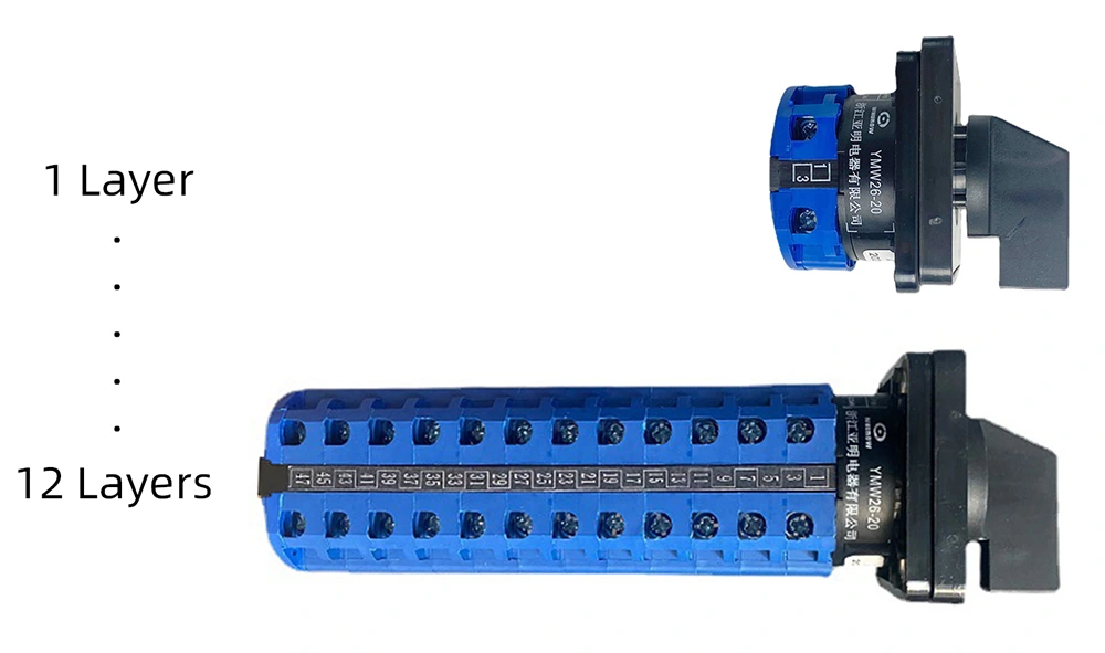 さまざまな顧客の特定のニーズを満たすために、当社は完璧な分類およびカスタマイズシステムを確立しました。スイッチは目的に応じて主回路変換、モーター制御、主コマンド制御および測定に分けることができます。動作モードは位置決めタイプ、自己復帰タイプ、位置決め自己復帰タイプをカバーします。位置決めタイプ(1~12セクション)、自己復帰タイプ(1~3セクション)、モータ制御タイプ(1~6セクション)に応じてシステムセクション数を柔軟に選択でき、特殊セクションのカスタマイズにも対応します。変換角度は30°、45°、60°、90°のオプションがあり、パネルの形状も正方形、円形などに適応し、ニーズに応じて変更できます。